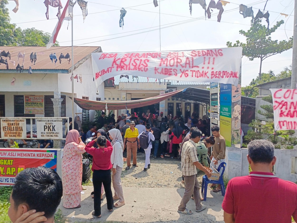 Tanjung Pura – Kantor Desa Serapuh Asli, Kecamatan Tanjung Pura, Langkat diduduki ratusan warga, Jum’at (2/8/2024) pagi. Di sana, mereka menolak dengan tegas permohonan maaf NH, oknum kades yang diduga melakun perbuatan asusila. Massa yang gerah, mengusir NH dari kantor desa sembari melemparinya dengan bra.