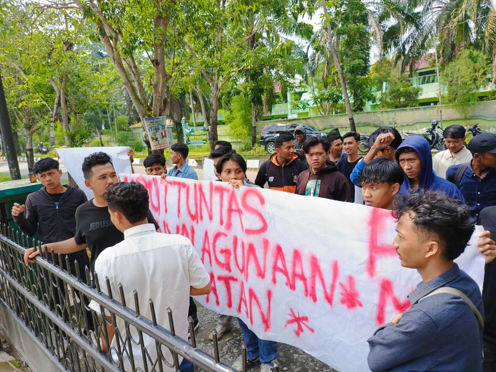 Puluhan massa dari aliansi mahasiswa berorasi di depan Kantor Dinas PMD Kabupaten Langkat, Rabu (26/6/2024) siang.
