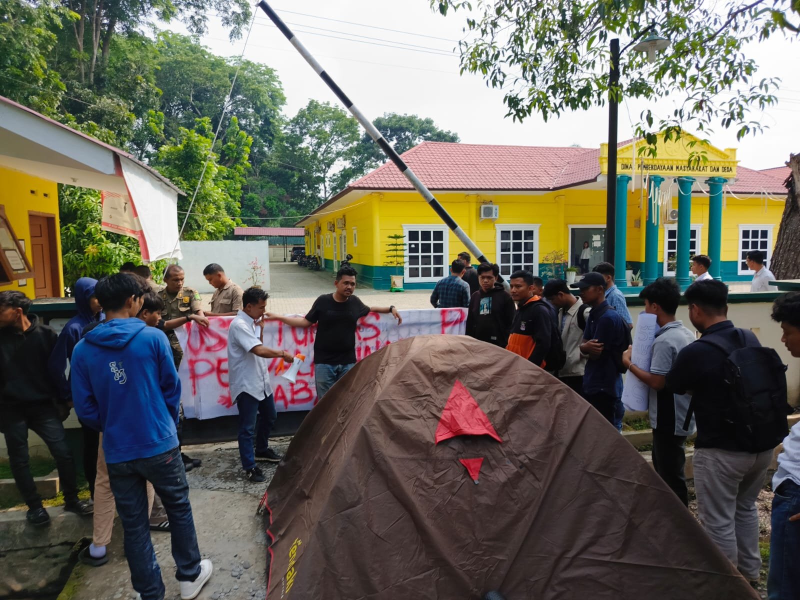 Usai berorasi, puluhan massa dari aliansi mahasiswa mendirikan tenda di depan Kantor Dinas PMD Kabupaten Langkat, Rabu (26/6/2024) siang.