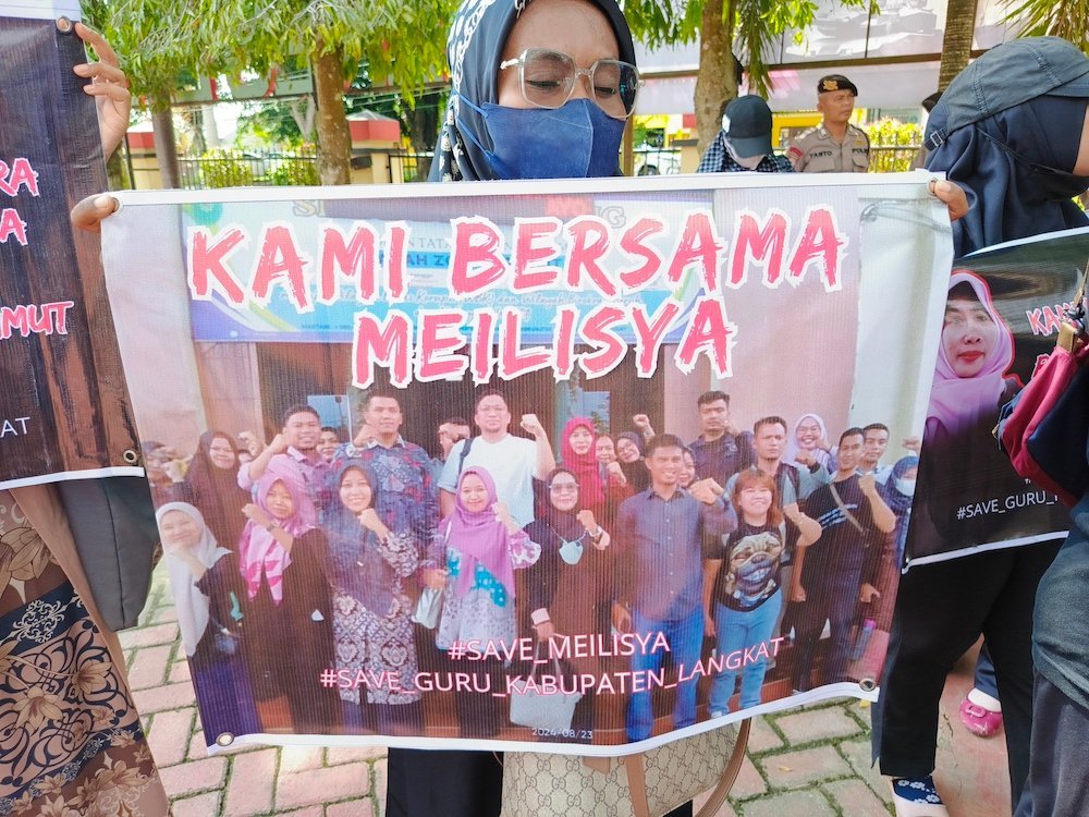 Di sana, para guru honer membentangkan poster-poster bertuliskan dukungan moril untuk Meilisya. Diantaranya, ‘Kami Bersama Meilisya’ dengan tagar #Save_Meilisya dan #Save_Guru_Kabupaten_Langkat.