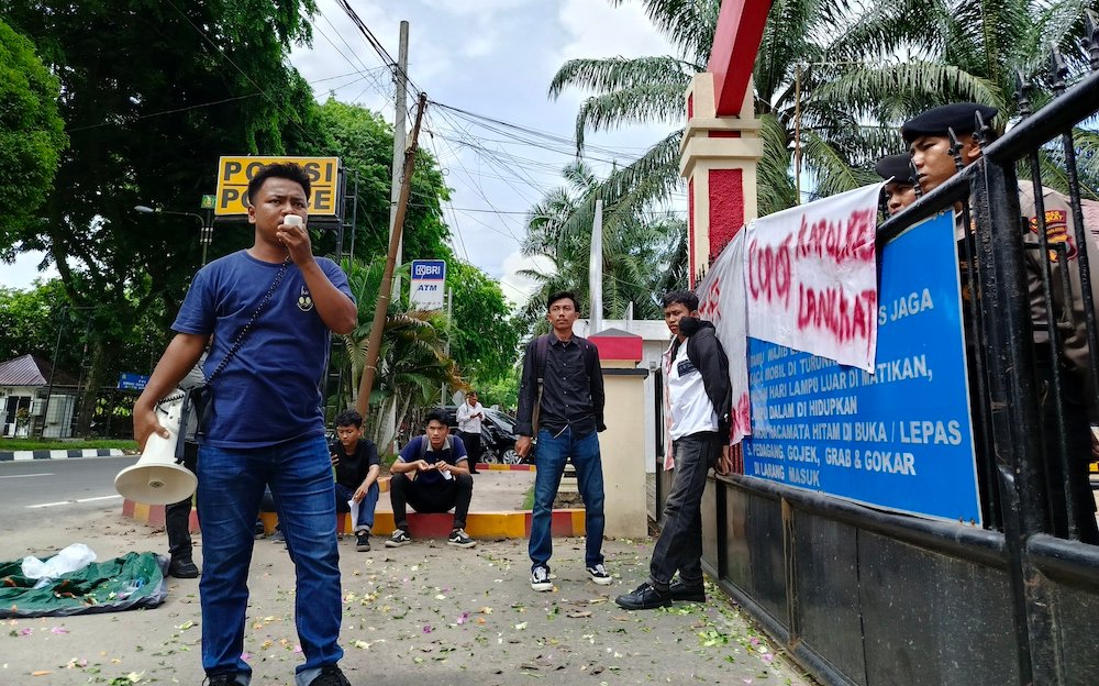 Dalam aksinya, sekelompok mahasiswa ini memasang spanduk di pagar depan Mapolres Langkat. Salah satunya memuat narasi yang bertuliskan ‘Copot Kapolres Langkat’.